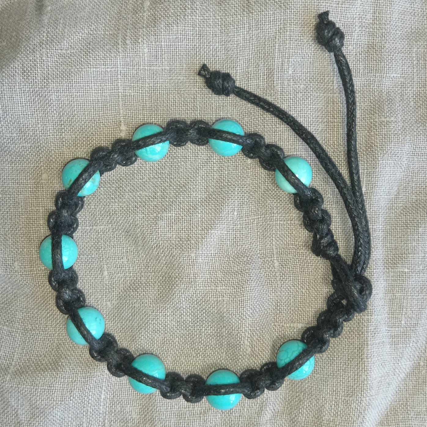 Pierres gemmes naturelles (Howlite) teintées, perles rondes 8 mm, lacet de coton ciré noir, longueur +/- 19cm, pièce unique (cliquez sur la photo pour plus de détails).