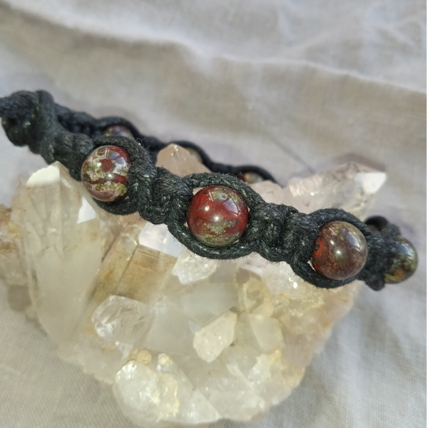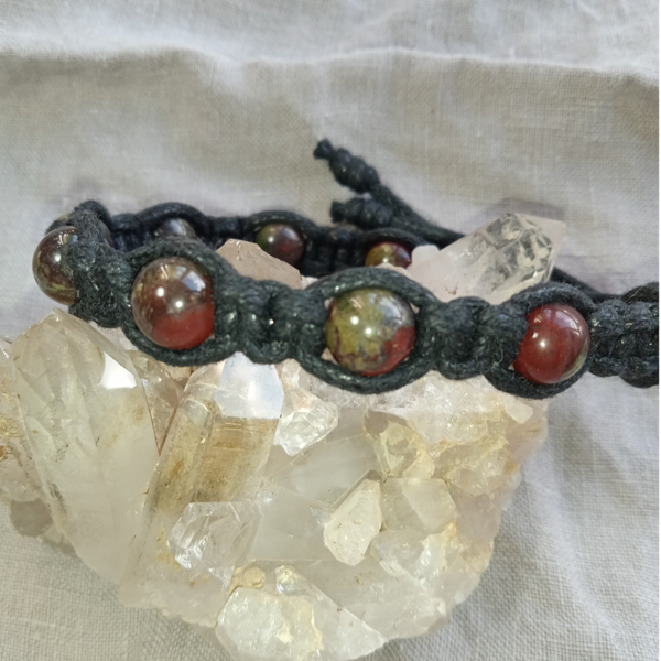 Petite histoire ... de la grande famille des quartz microcristallins, il est essentiellement composé de silice et de nombreux oligo-éléments comme le carbonate de calcium et le magnésium et parfois d'argile. Ses incrustations rouges sang sont en réalité de la piémontite. Il doit son nom à quelques légendes originaires d'Afrique et de Scandinavie. Au moyen-âge, il était utilisé, réduit en poudre et ingéré, pour lutter contre les tumeurs. il est très prisé en joaillerie.