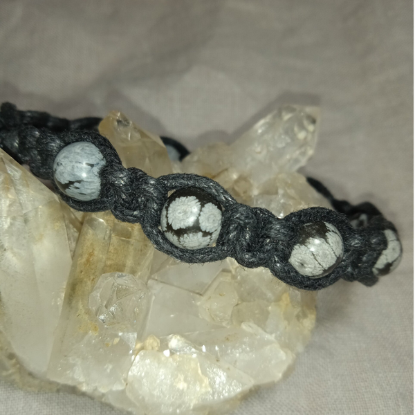 Petite histoire... la grande famille des obsidiennes est d'origine volcanique. Il s'agit de pierres dites amorphes (sans structure atomique précise, contrairement aux cristaux) d'aspect vitreux et compact, issues du refroidissement rapide du magma. Ce sont les fines particules des différents métaux ou minéraux qui les composent qui confèrent à chaque obsidienne ses caractéristiques particulières et ses couleurs. Pour l'obsidienne neigeuse, il s'agit de particules de cristobalite, une forme de dioxyde de silicium, qui génèrent les taches d'aspect neigeux qui lui donnent son nom. On la nomme également obsidienne flocon ou obsidienne nuage. Plus compact et plus solide que le verre, elle était autrefois employée, par les premiers hommes, comme tranchoir ou comme pointe de flèche !