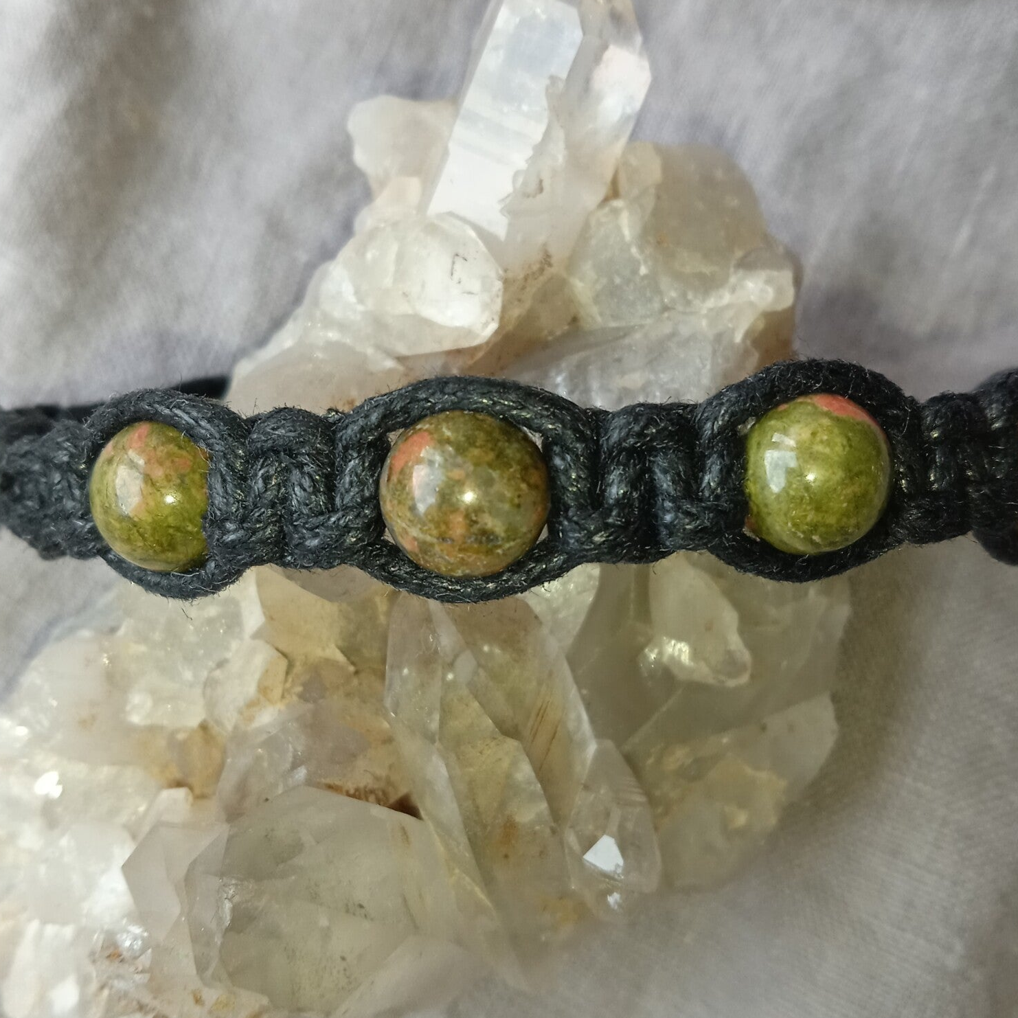 Petite histoire... elle doit son nom aux Montagnes Unaka, situés au Sud des États-Unis, où elle fût découverte au tout début du 19ème siècle. On l'appelle également épidote. Elle appartient à la famille des granites altérés. On dit des pierres roses qu'elles ouvrent les cœurs trop fermés et des pierres vertes qu'elles referment les cœurs trop ouverts. L'unakite, à la fois verte et rose, équilibre donc le cœur tout comme la Zoïsite-Rubis. C'est la pierre de "la voie du juste milieu" enseignée par le Bouddha. On trouve d'ailleurs beaucoup de Bouddhas sculptés dans cette pierre !