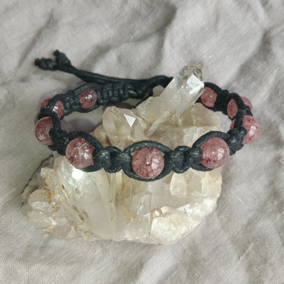 Petite histoire... proche parent du quartz rose, le quartz fraise, aussi appelé quartz cerise quand il est très rouge, doit sa couleur à la présence de manganèse dans sa structure cristalline et doit son nom à des incrustations d'oxyde de fer et de titane lui donnant cet aspect granité qui fait penser aux multitudes de graines présentent sur les fraises.