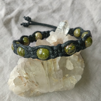 Petite histoire... elle doit son nom aux Montagnes Unaka, situés au Sud des États-Unis, où elle fût découverte au tout début du 19ème siècle. On l'appelle également épidote. Elle appartient à la famille des granites altérés. On dit des pierres roses qu'elles ouvrent les cœurs trop fermés et des pierres vertes qu'elles referment les cœurs trop ouverts. L'unakite, à la fois verte et rose, équilibre donc le cœur. C'est la pierre de "la voie du juste milieu" enseignée par le Bouddha. On trouve d'ailleurs beaucoup de Bouddhas sculptés dans cette pierre !